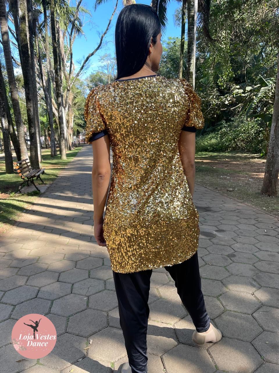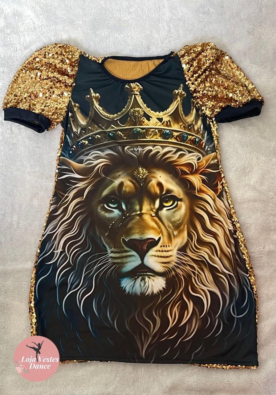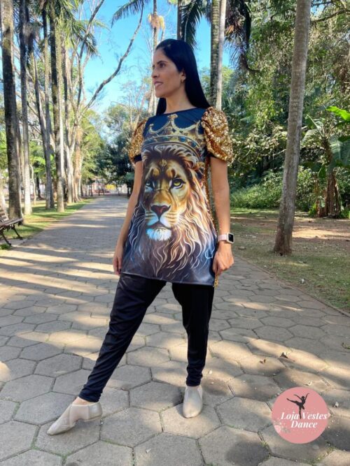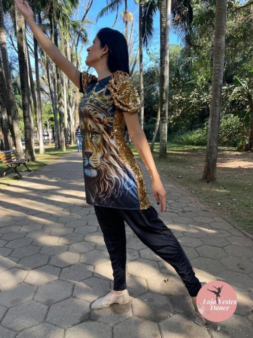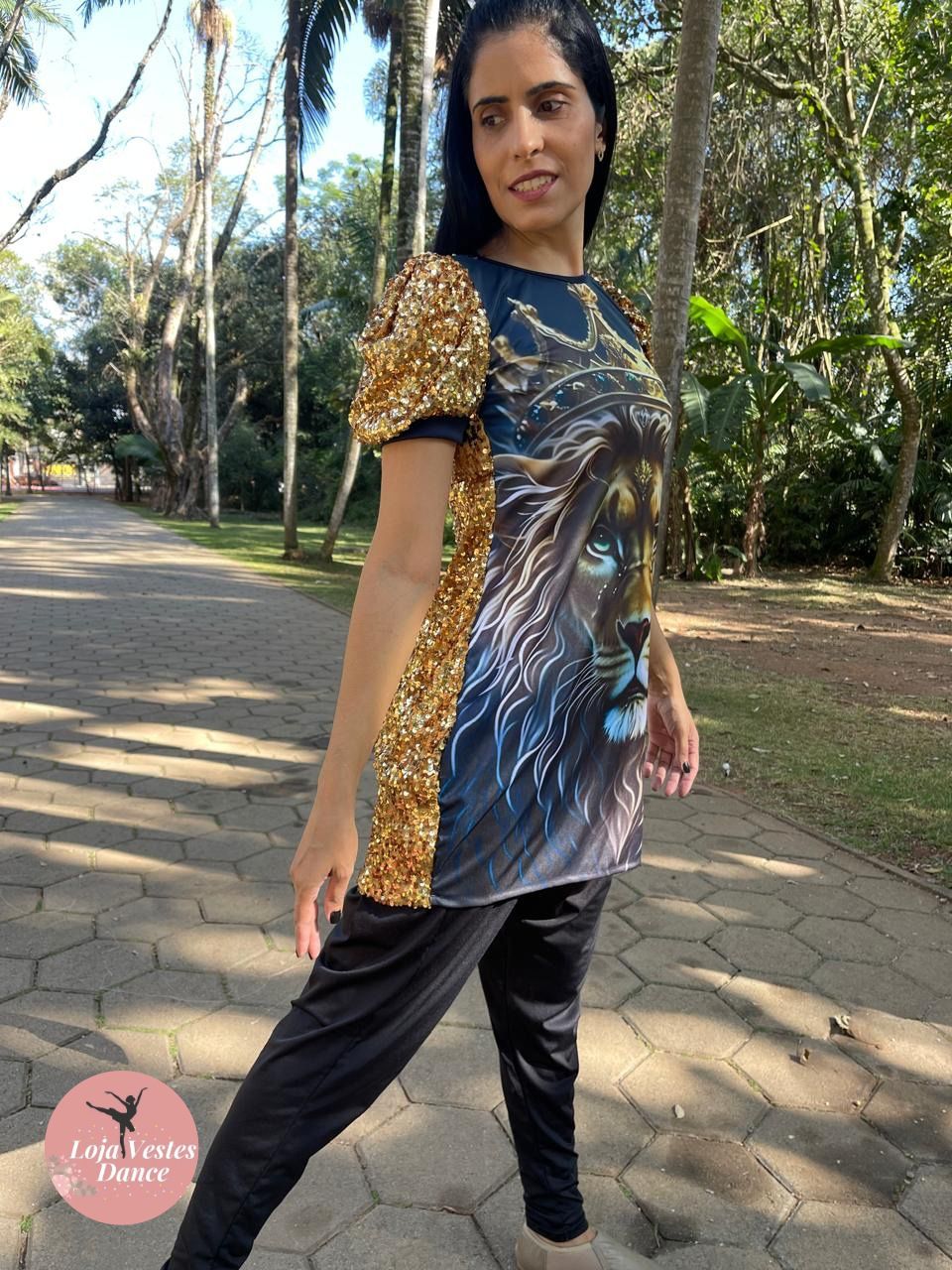 Bata com estampa de leão, costas de paitê dourado e manga curta princesa também de paitê.