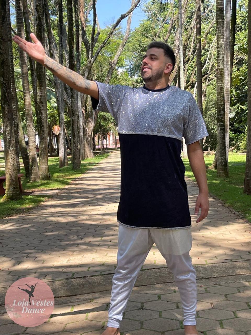 Camisa de veludo com detalhe de tela prata e aviamento.