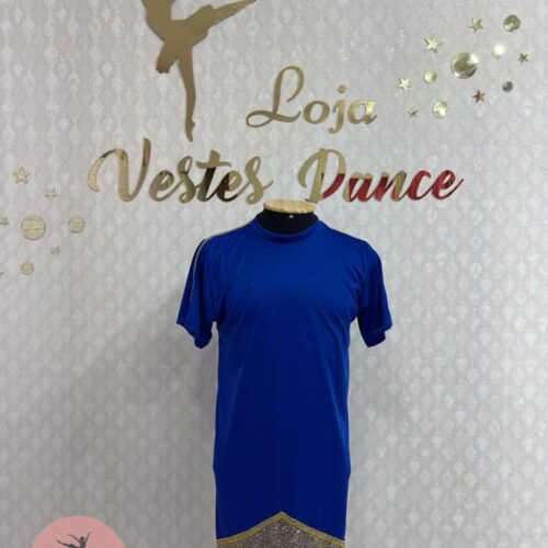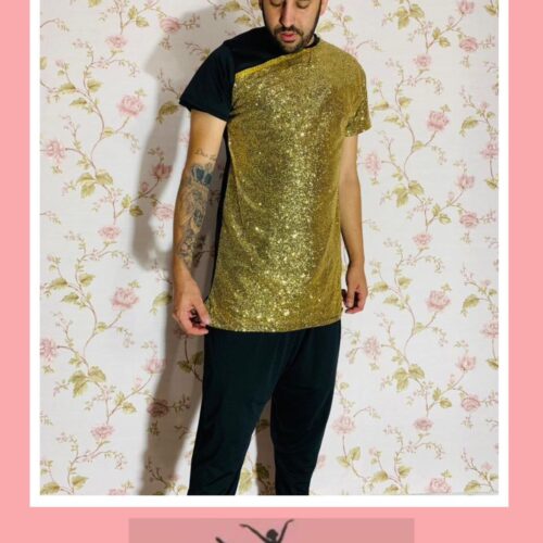 Camisa de helanca com frente e mangas de paetê, com detalhes de aviamento.