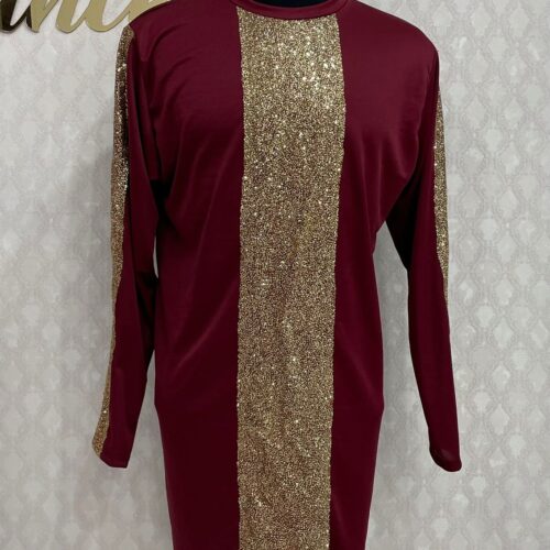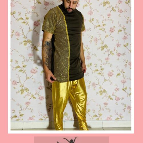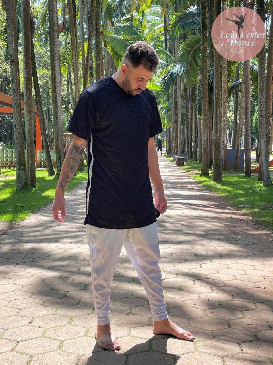 Camisa de helanca com tule gliter e detalhes de aviamento.