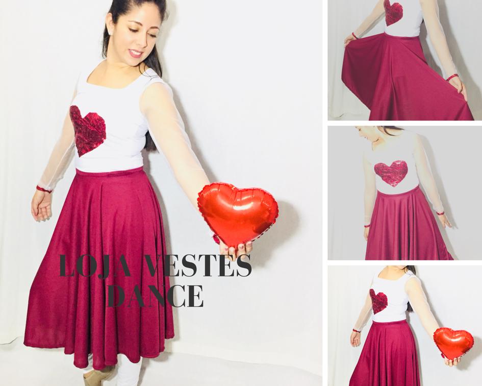 Conjunto de blusa e saia com coração de Paetê e mangas de Tulê.