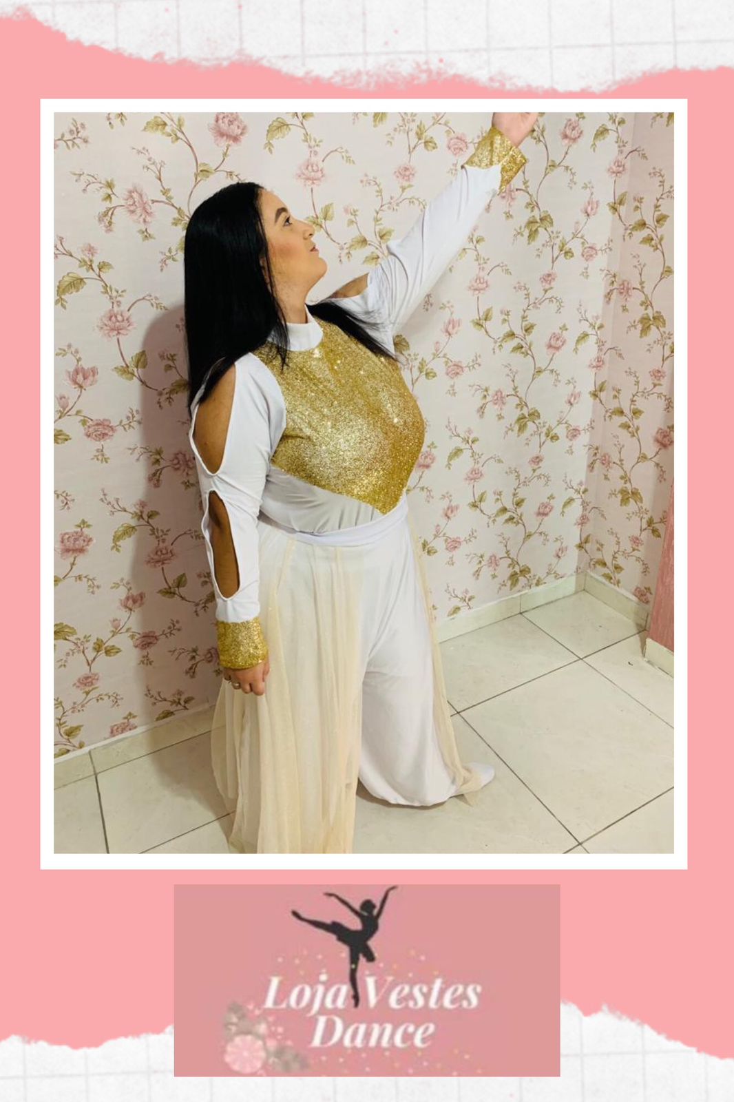 Collant de liganete, gola alta, manga longa com aberturas, tudo cheio no punho e detalhe de tule cheio em V no busto.