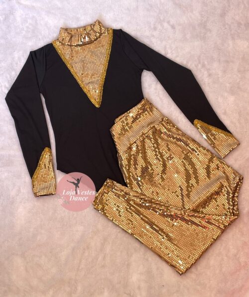 Body de liganete com detalhe de paetê, gola alta e manga longa de liganete com detalhe no punho de paetê, com aviamento dourado.