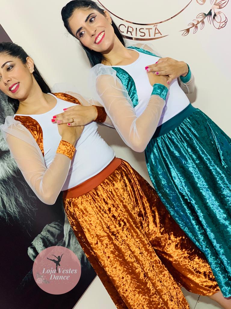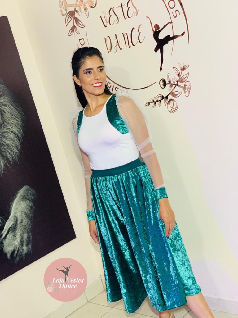 Conjunto c/borie de liganete, mangas de tule ilusion, detalhes de veludo molhado, bermuda godê de veludo molhado e coz de helanca.