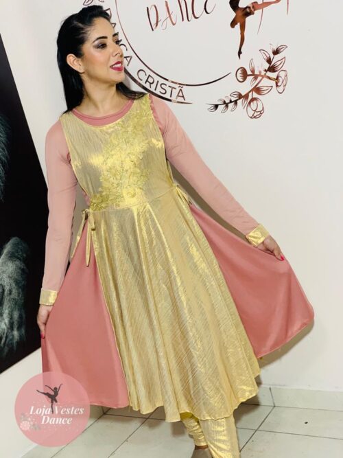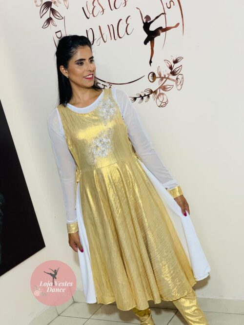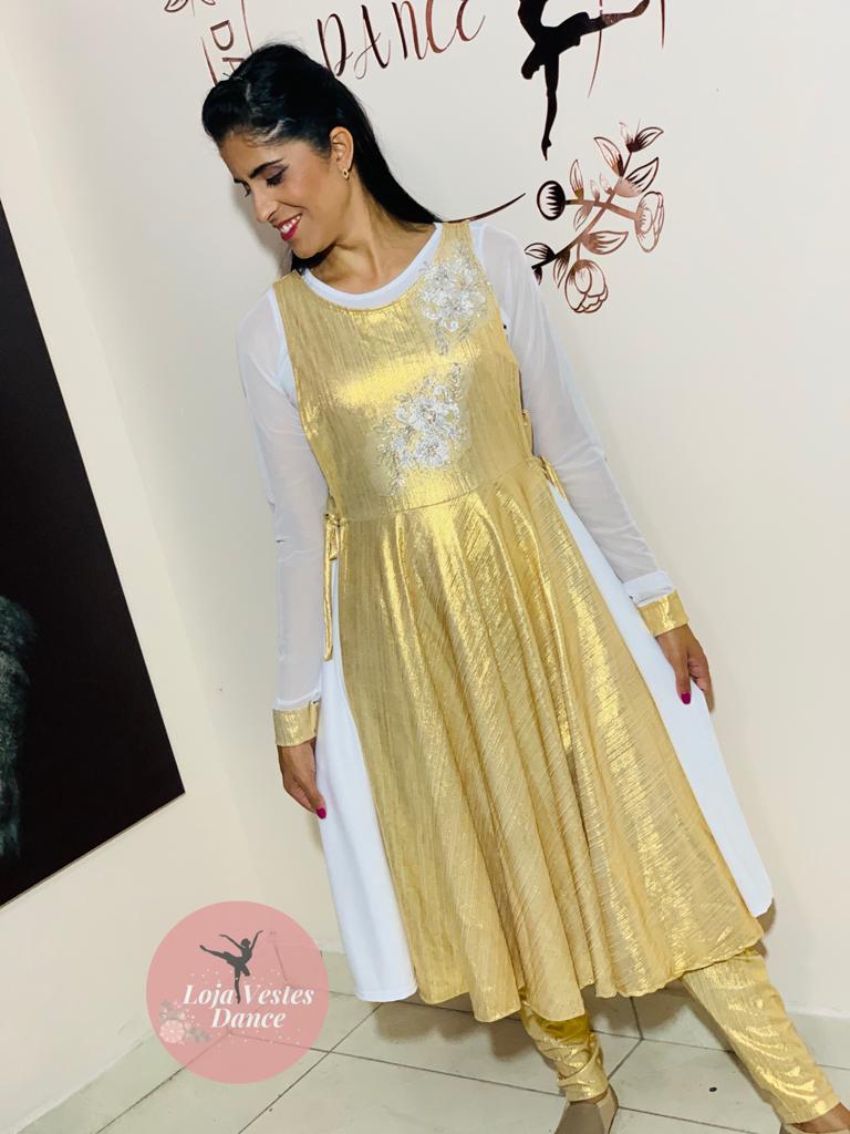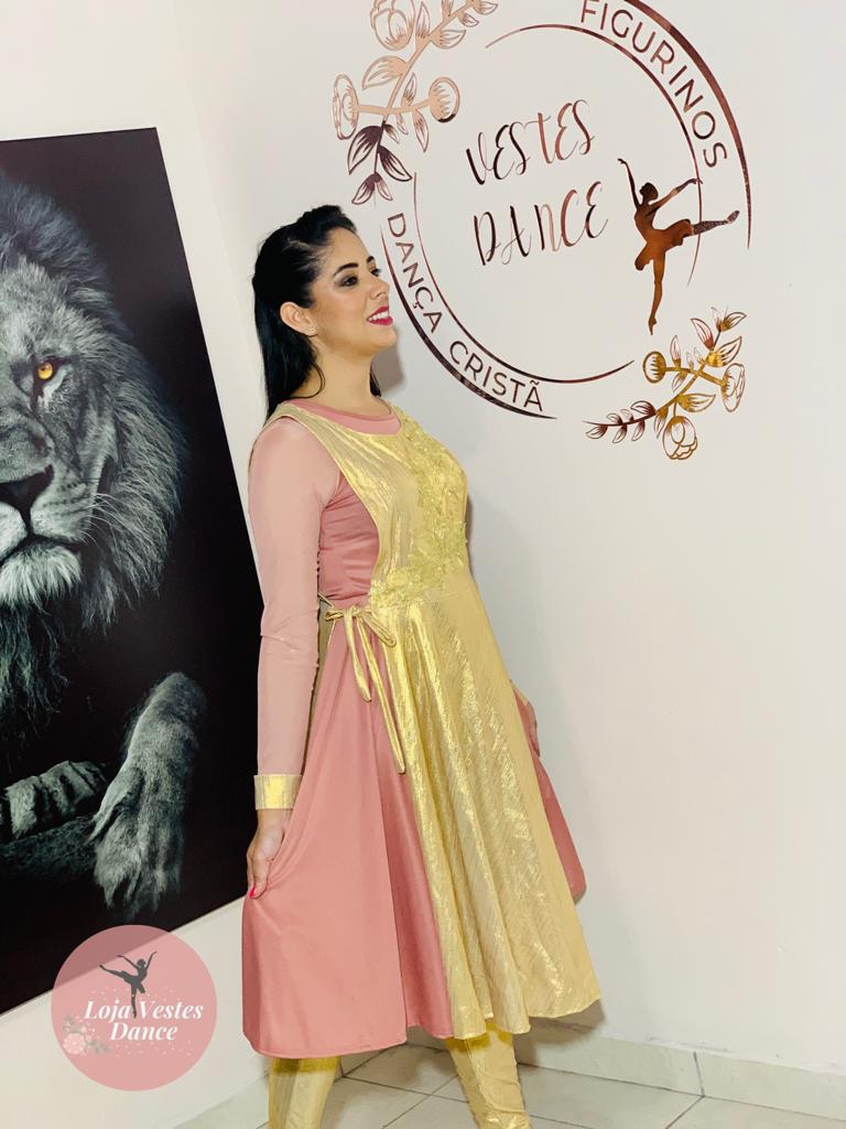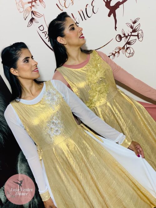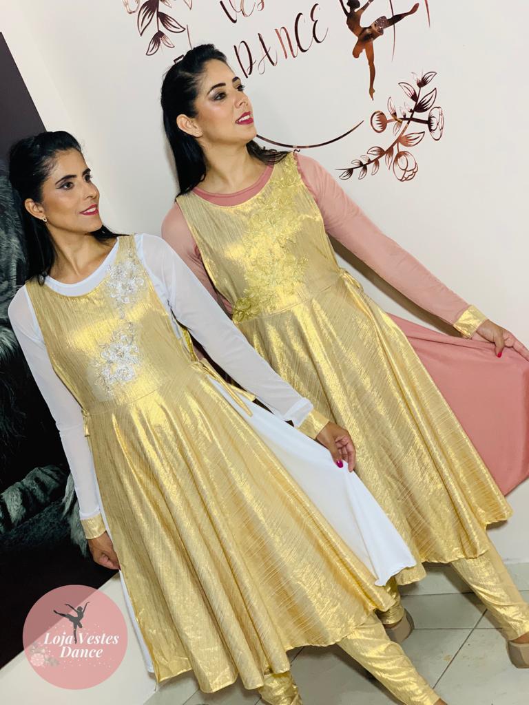 Cores da foto: Vestido branco/rosê com capa dourada.