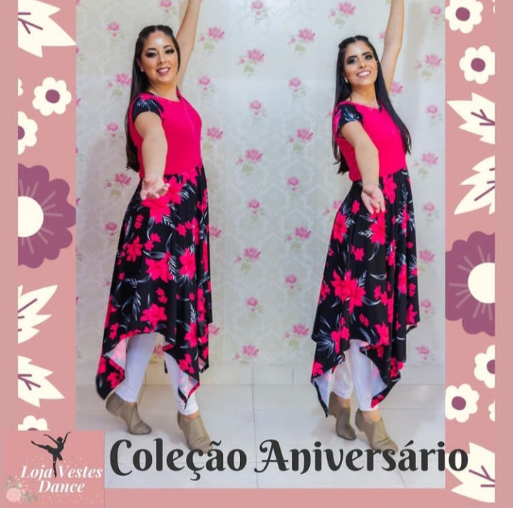 Vestido floral pink preto de suplex e busto pink de helanca.