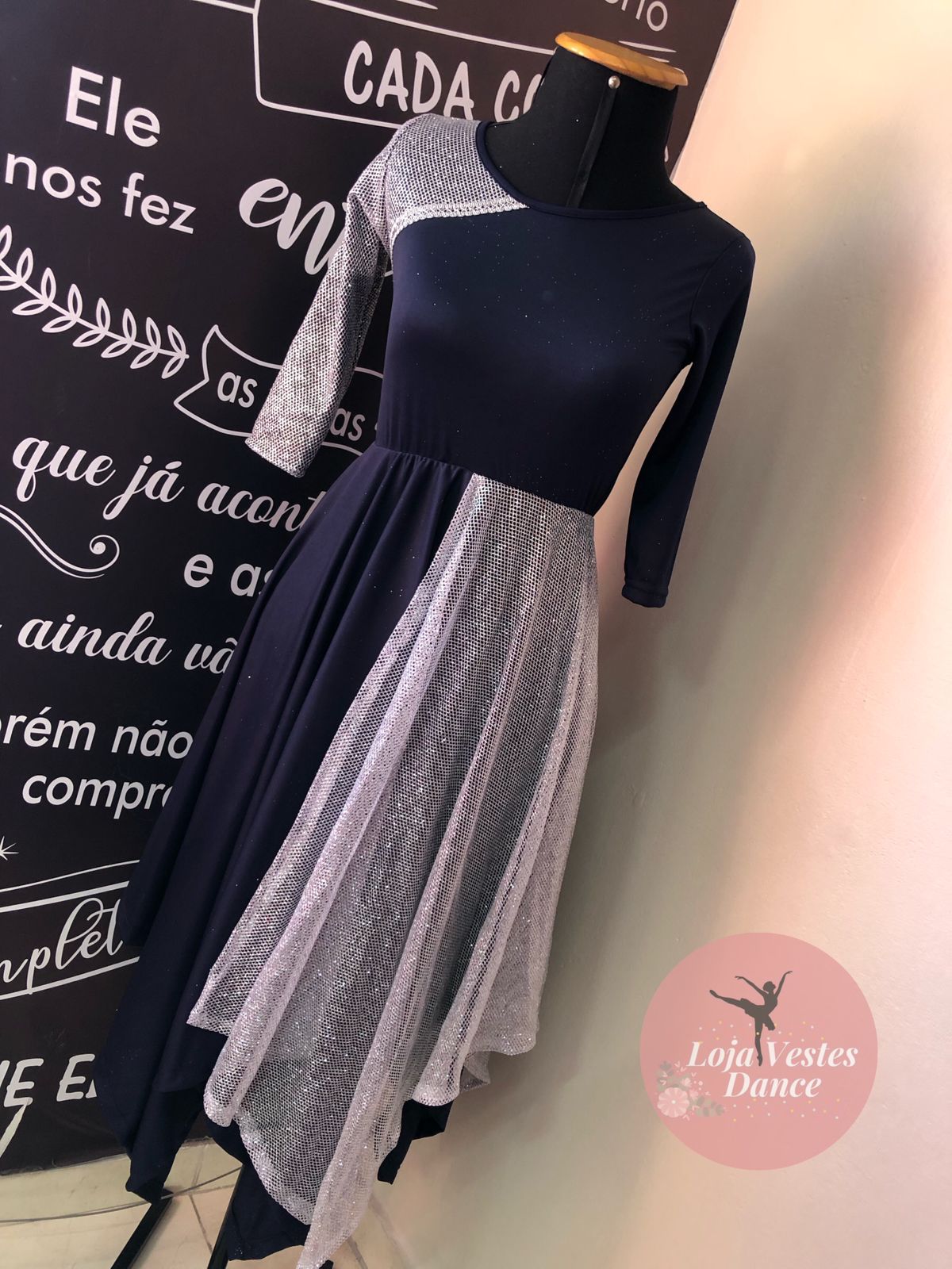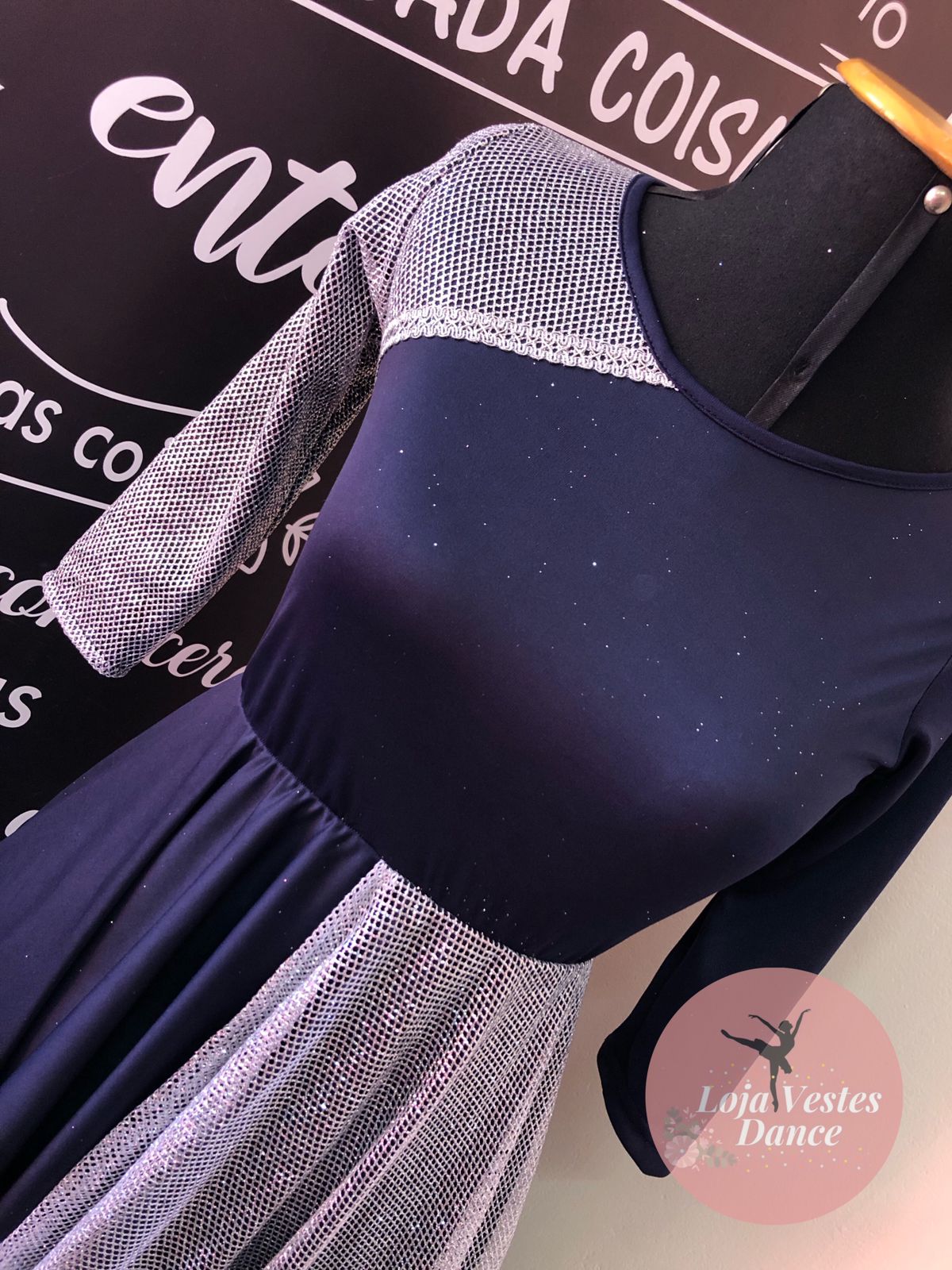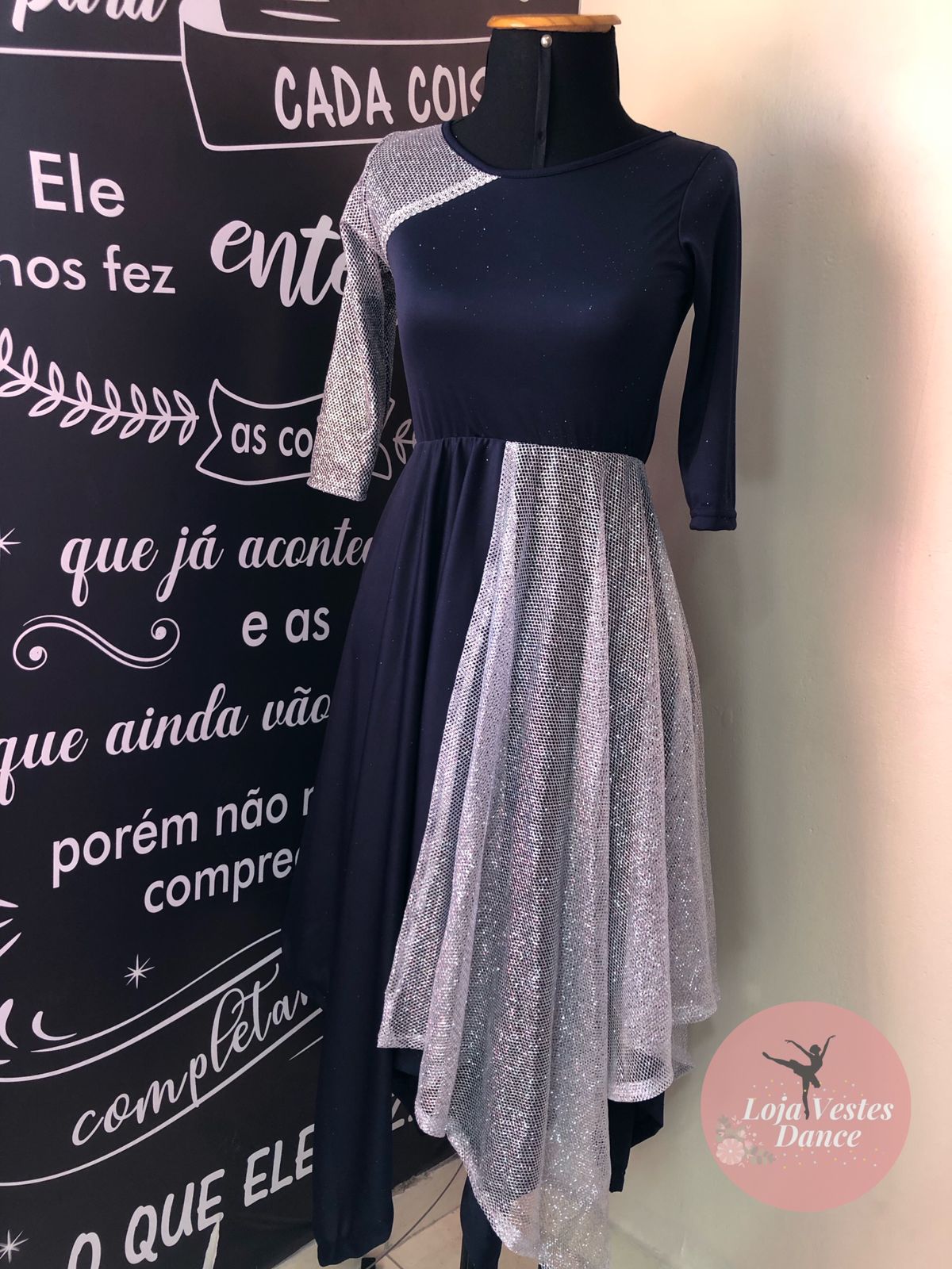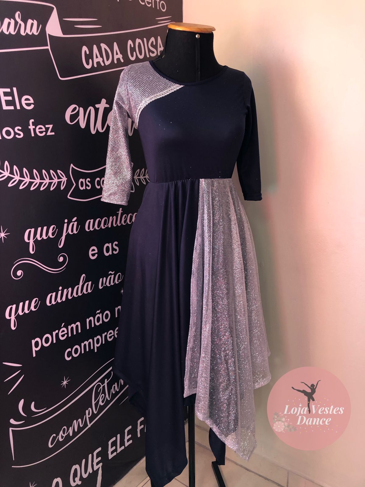 Vestido de Helanca com detalhes de tela arrastão com glitter e aviamento.
