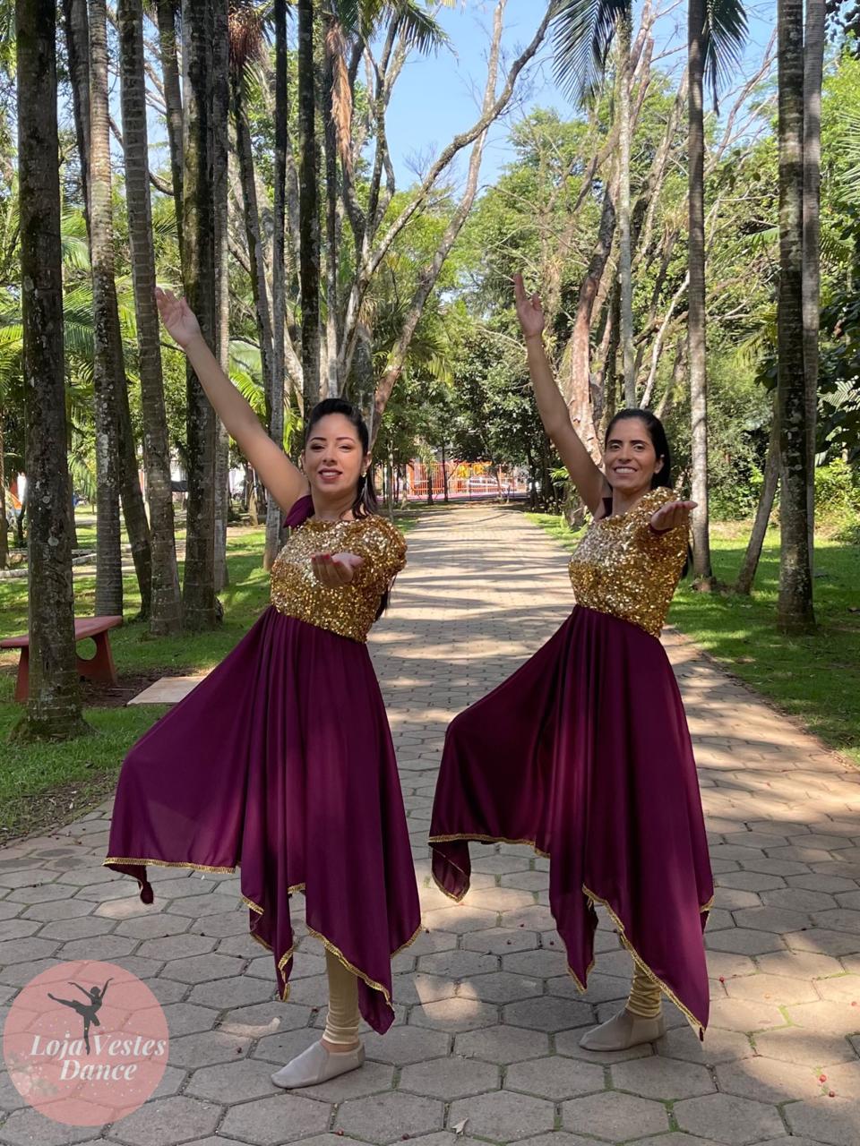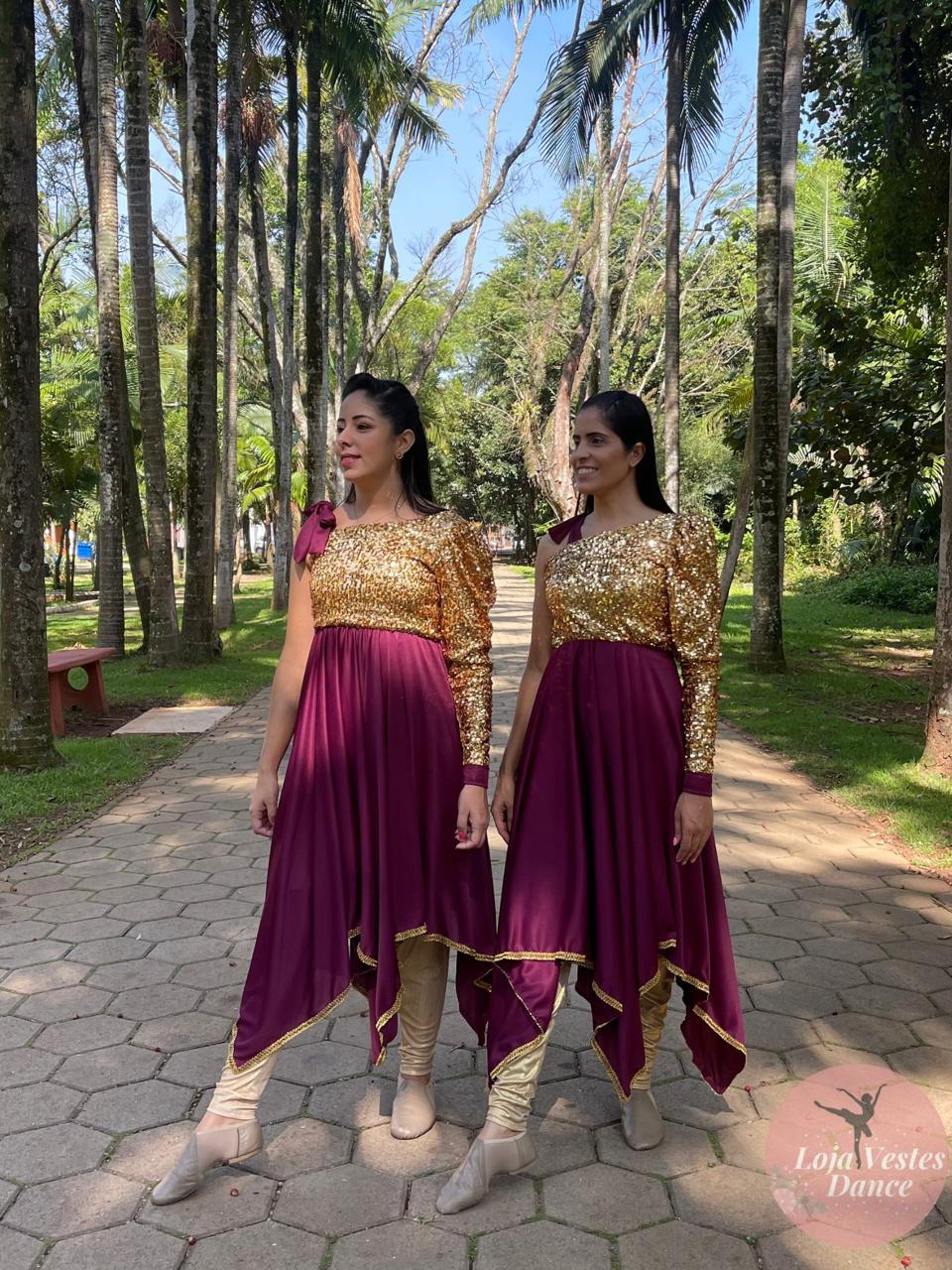 Vestido com saia 4 pontas de helanca, busto de helanca com paetê, manga bufante de paetê e aviamento na barra.