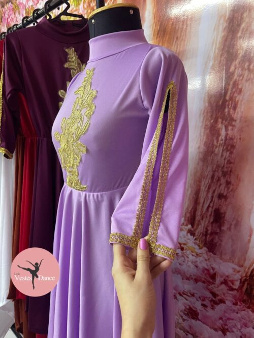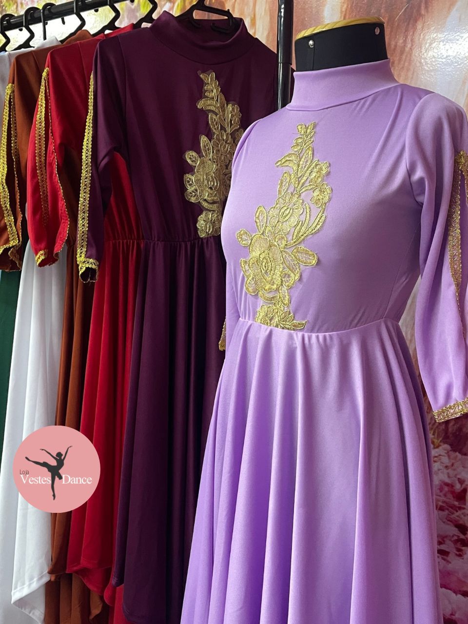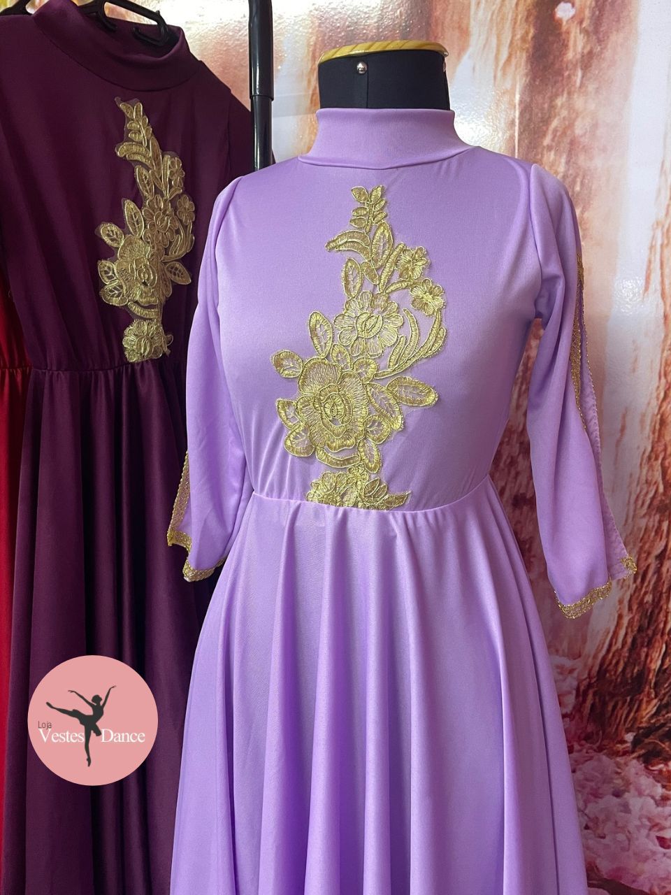 Vestido de helanca, gola alta com aplique de flores e detalhes de aviamento. (manga aberta)