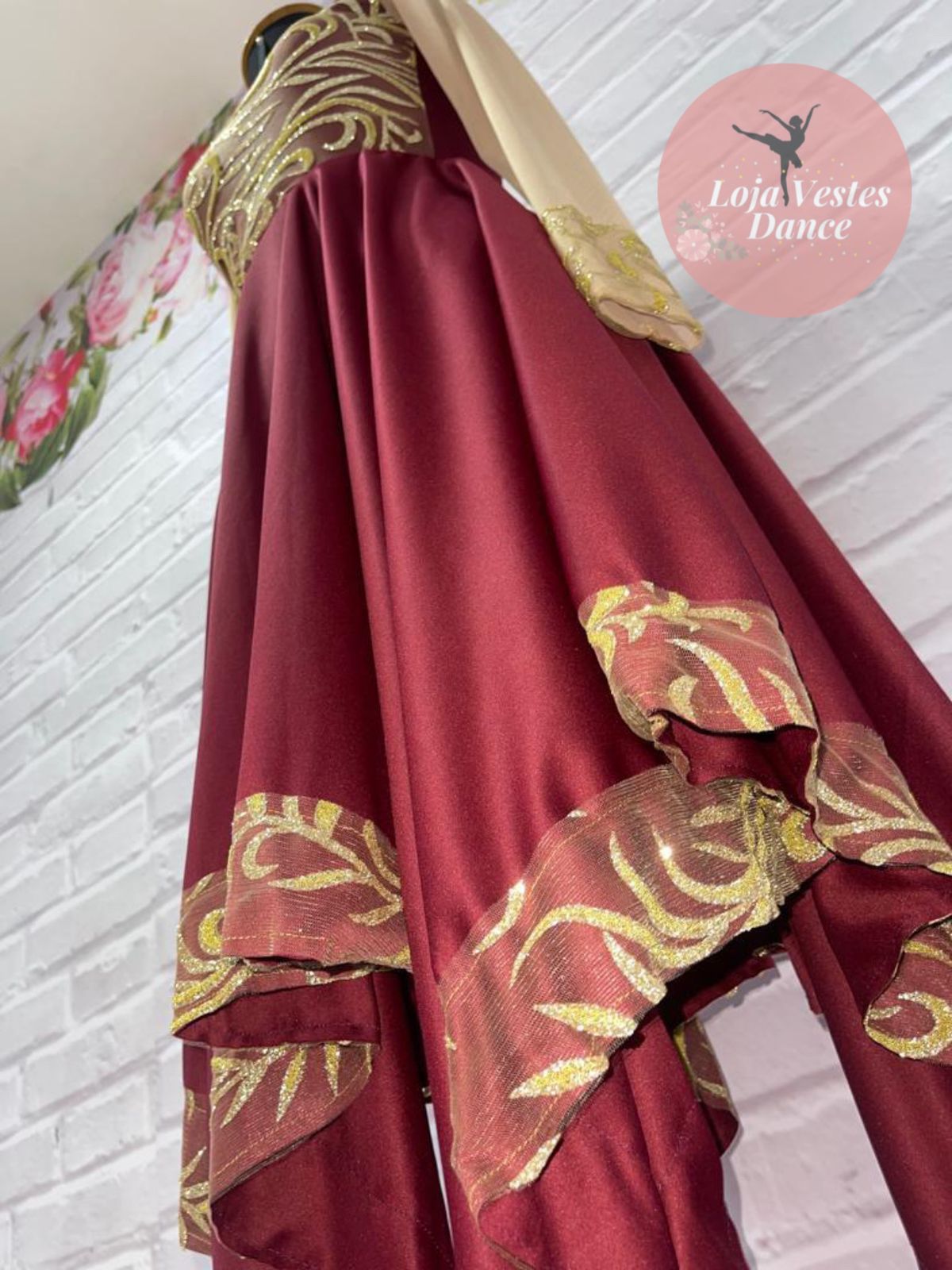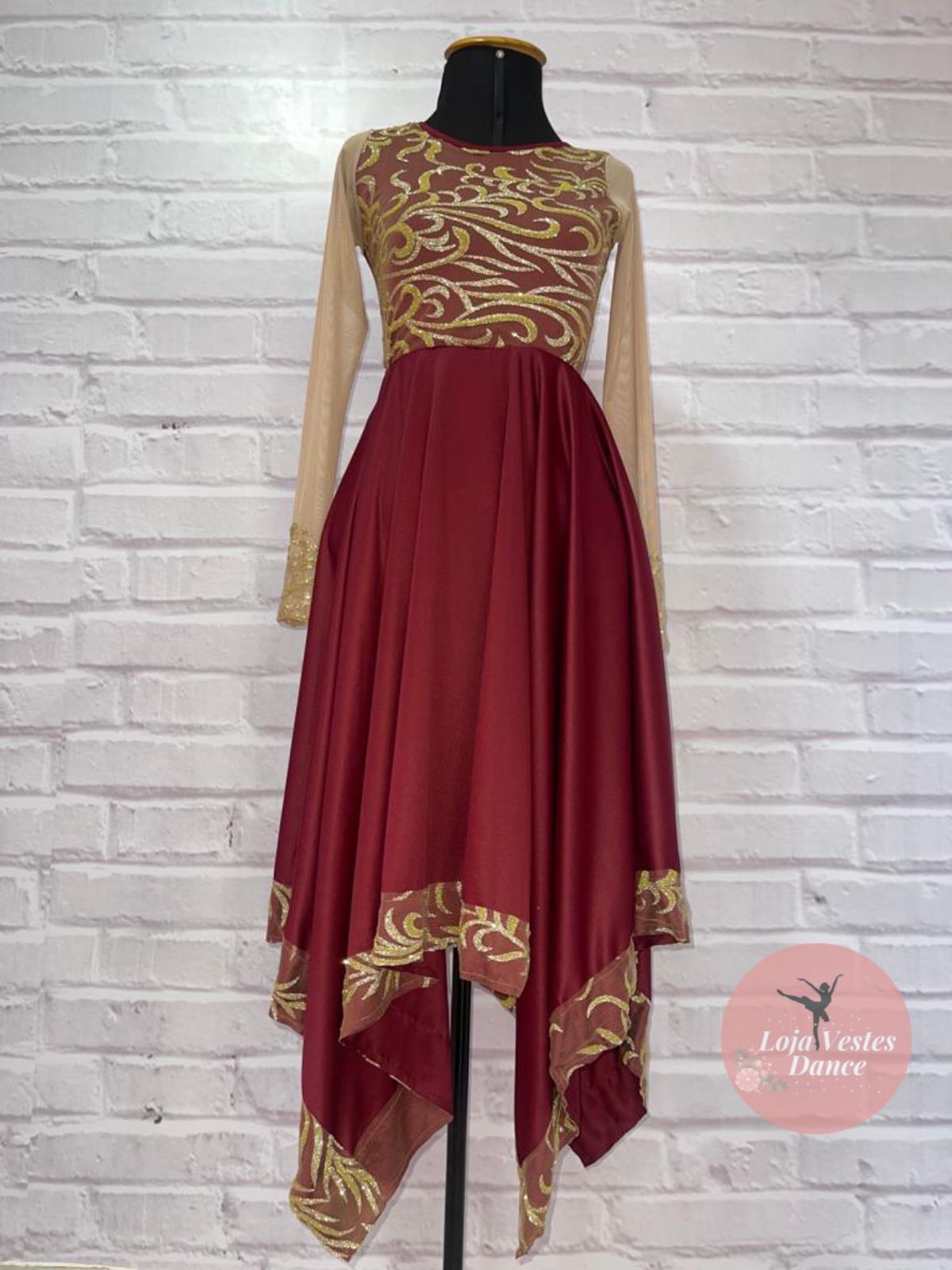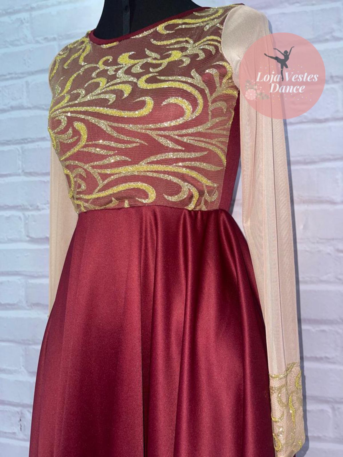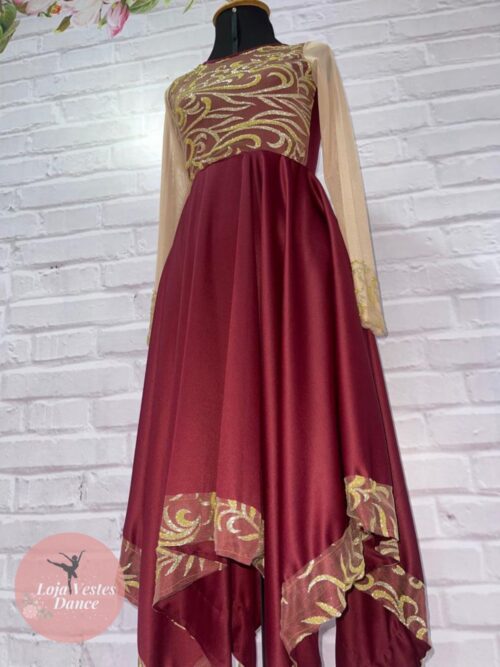 Cores da foto: Busto vinho, saia vinho, tule desenhado dourado, malha ilusion nude.