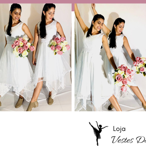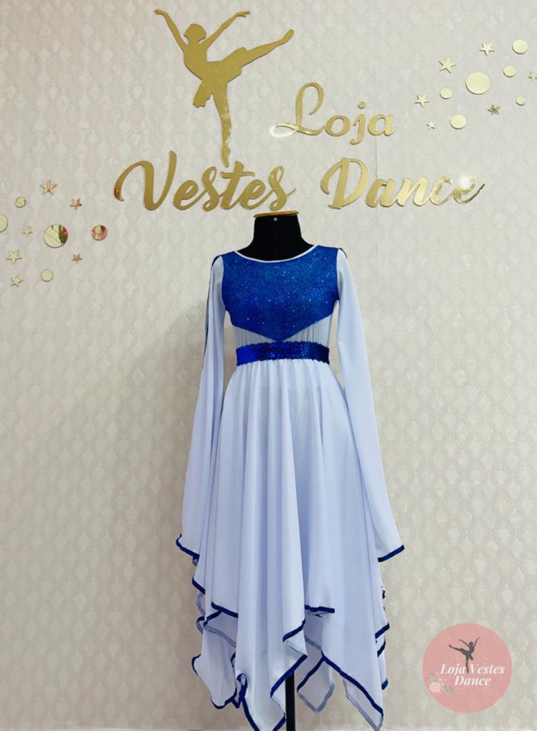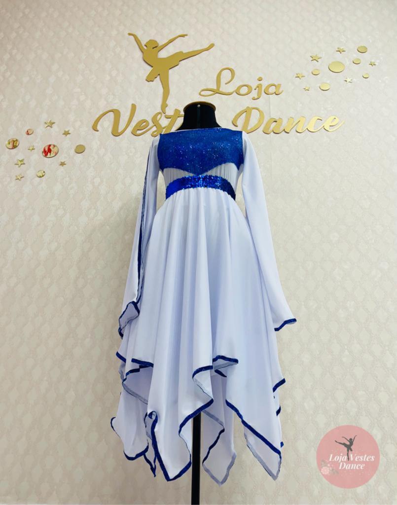 Vestido de helanca, com busto de tule cheio, manga godê de helanca, aviamento na barra e nas mangas. Cinto de paetê.