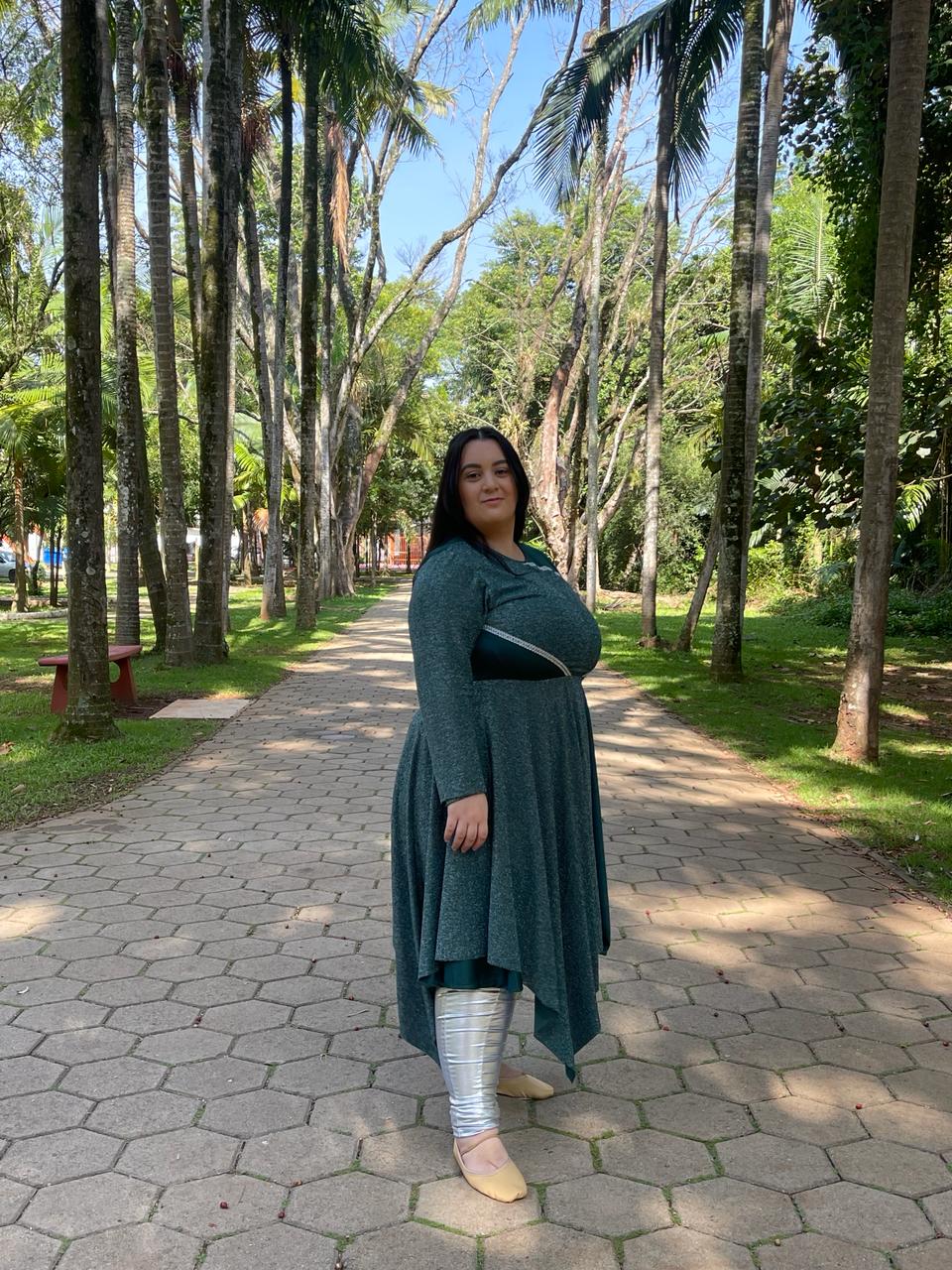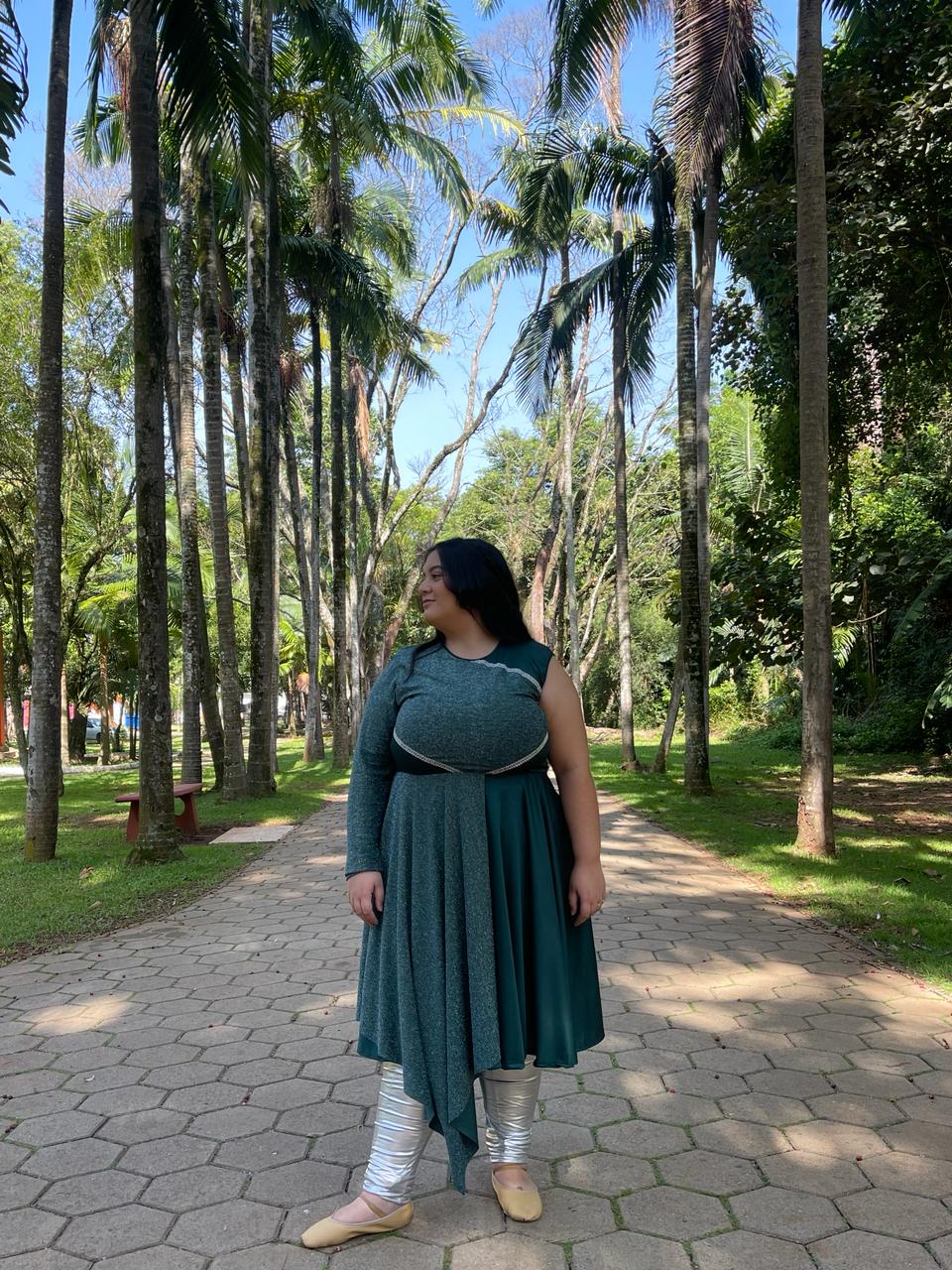 Vestido de helanca com saia godê, com detalhes, uma manga longa, saia 4 pontas de lurex e detalhes de aviamento.