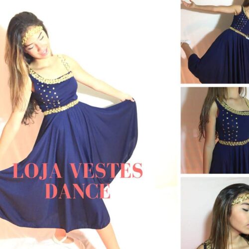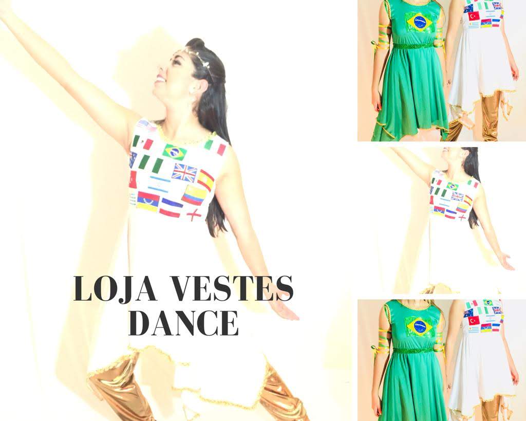 Vestido 4 pontas de Helanca com aplicação de Bandeiras e aviamento dourado na barra.