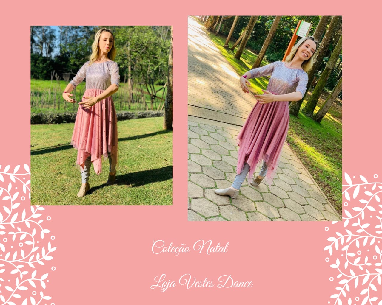 Vestido com saia de helanca e tulê pérola rosê e busto de tulê cheio com gliter prata.