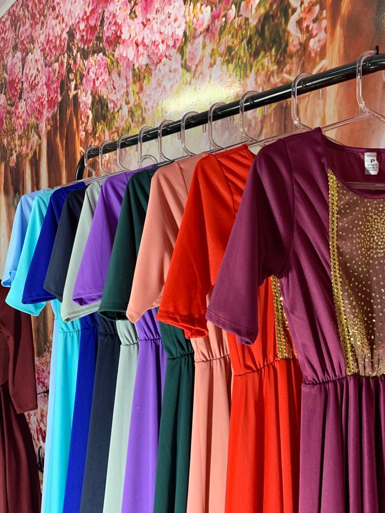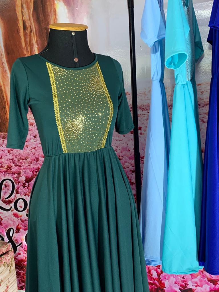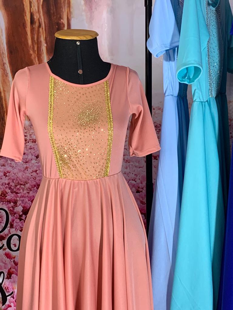 O vestido redenção é godê, manga de 30 cm e uma tira de tule explosão e aviamento dourado.