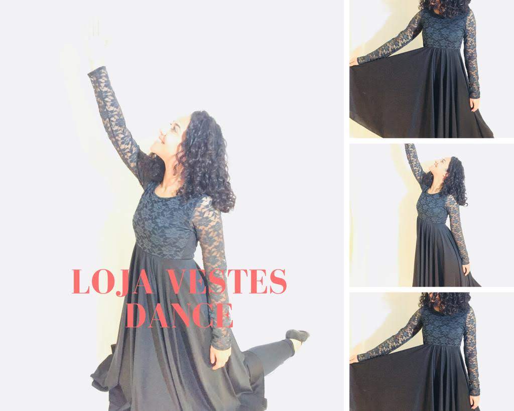 Vestido godê de Helanca, Renda no busto (frente) e mangas.