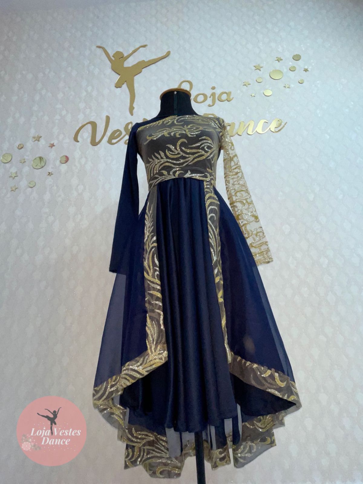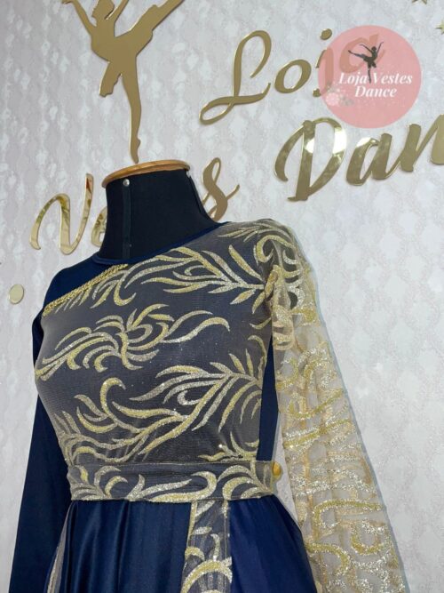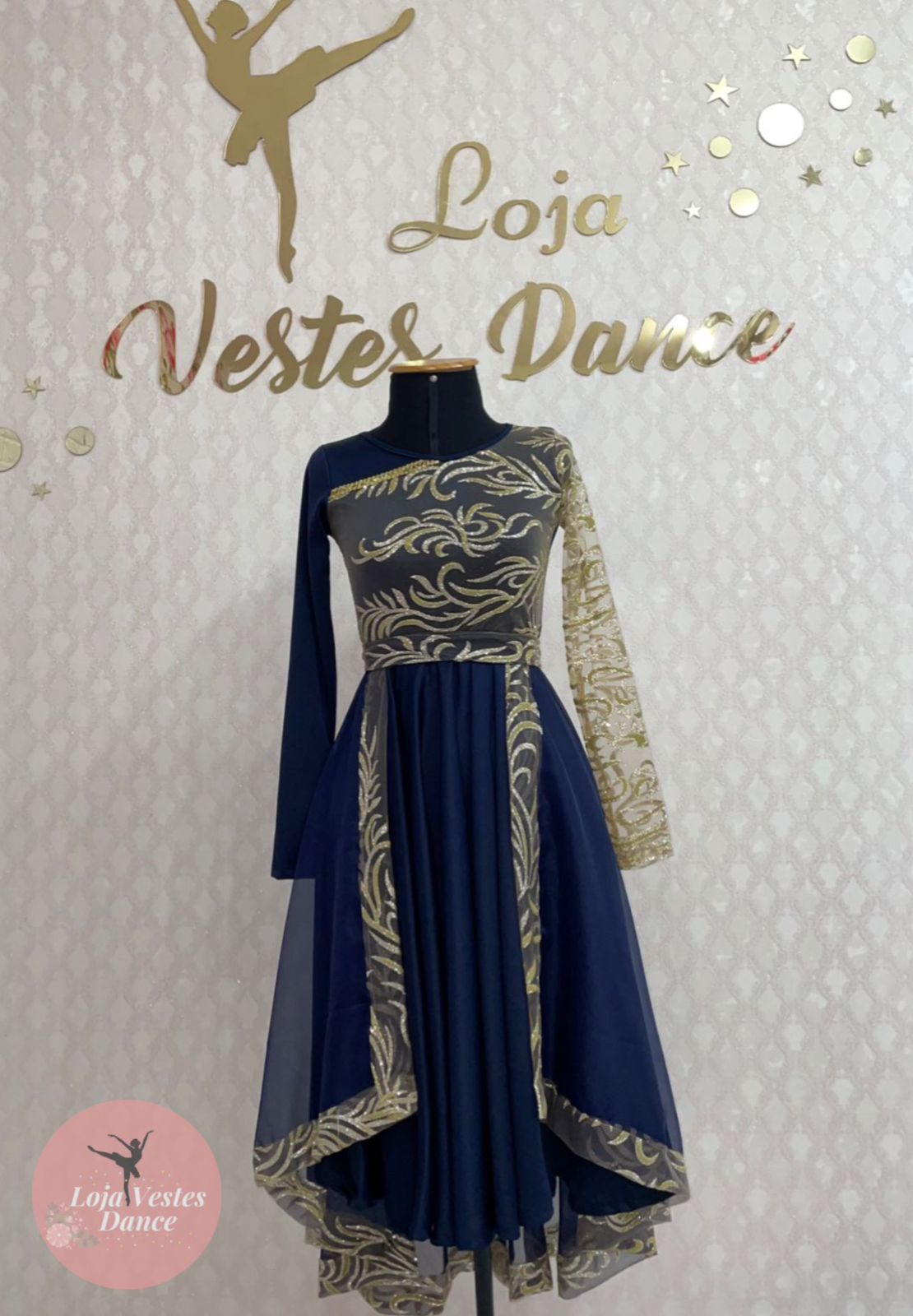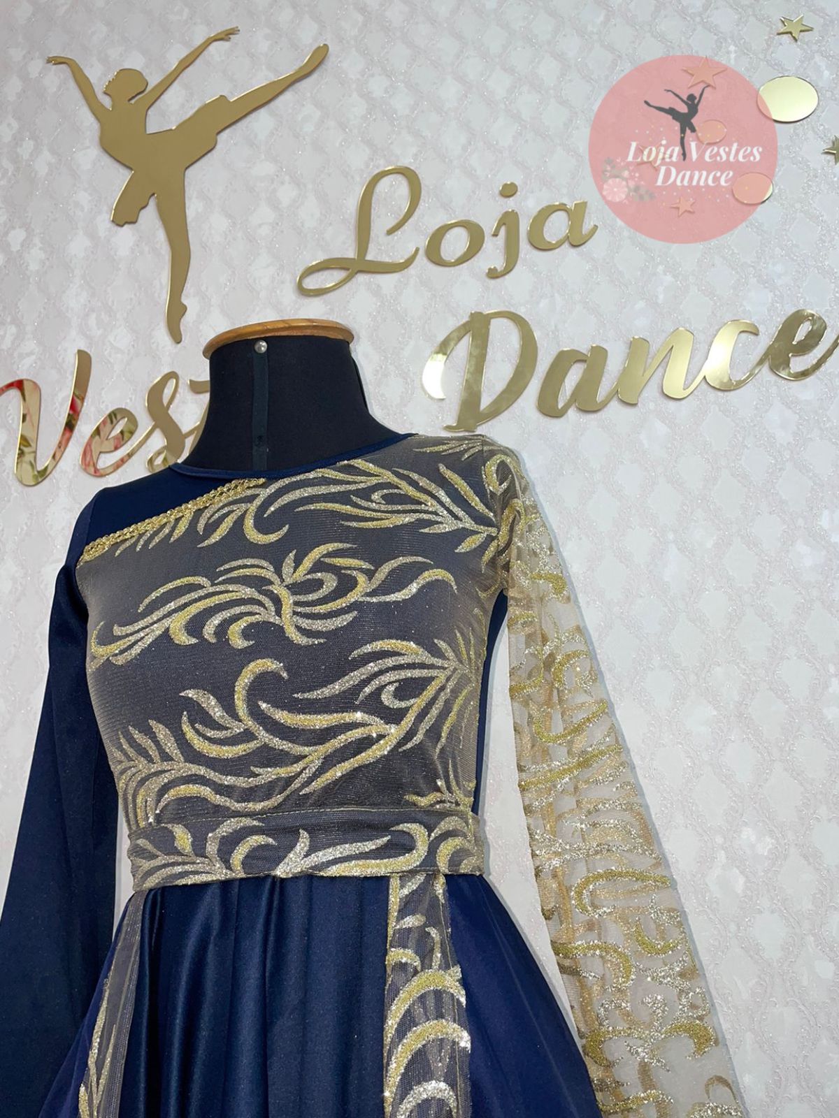 Vestido de Helanca, com busto e meia manga de tulê desenhado, saia de voal com detalhes na barra.
